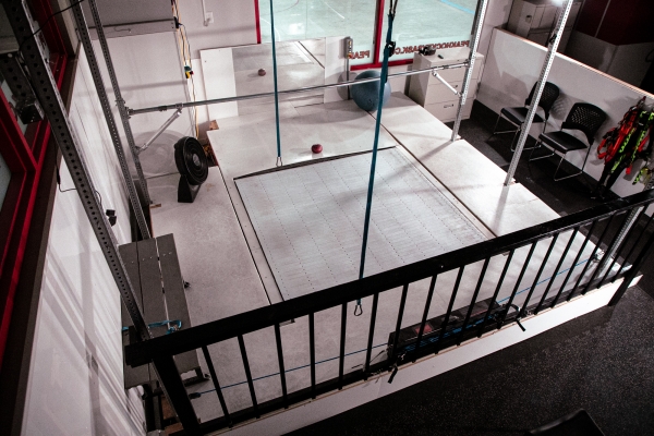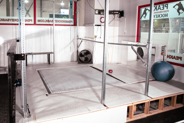 An adjustable safety bar allows for players of all ages to participate. It is a great tool for learn-to-skate ages to develop balance and edge control, or for experienced players to refine technique. Our treadmill is surrounded by a synthetic deck which allows for stick handling, passing, shooting in stride and multi-tasking.